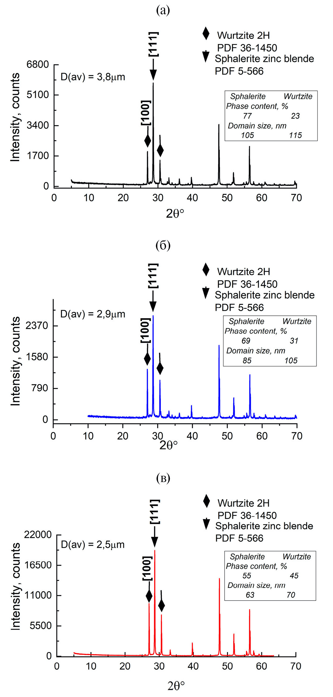 Рис. 1. Результаты рентгенофазового анализа ZnS:Cu(0.03),Br люминофоров, синтезированных: а – без использования ЭЛО; б – из электронно-модифицированной шихты; в – из электронно-модифицированной шихты с повторной ЭЛО готового люминоф