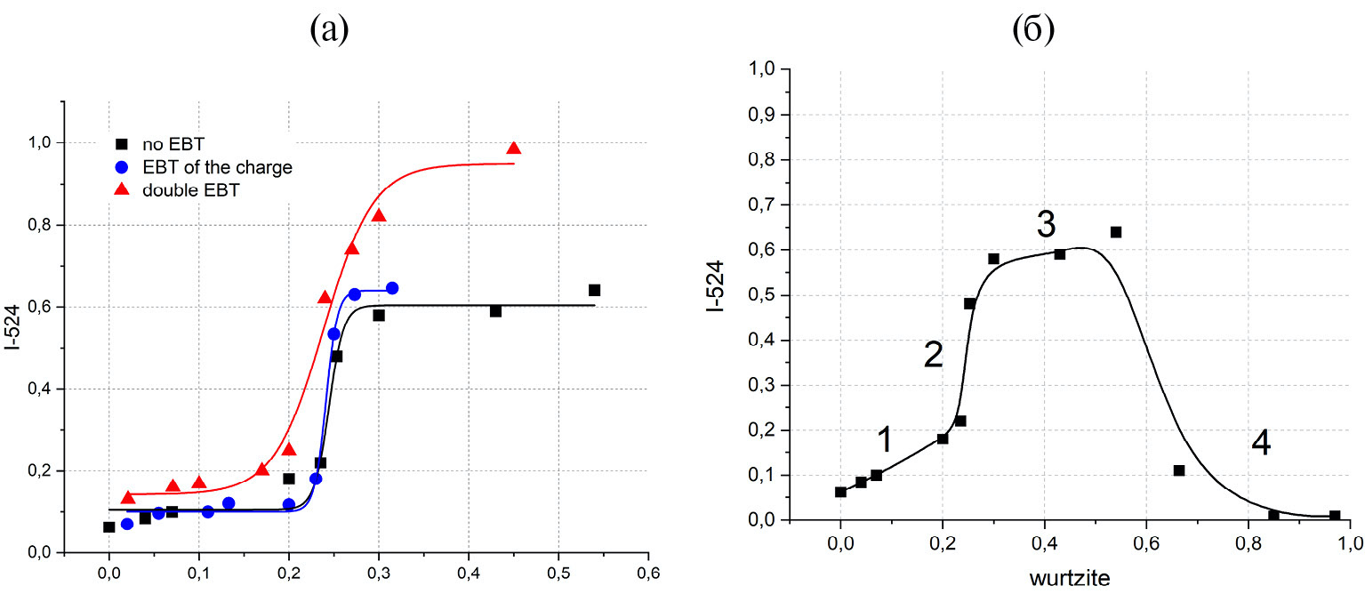 При превышении доли вюрцита в 50% – максимально смешанная структура с максимально протяженной границей раздела фаз вюрцит–сфалерит, обеспечивающей наилучшие условия для зернограничной диффузии – должно происходить уменьшение значения целевой функции. Действительно, для серии образцов, не подвергавшихся ЭЛО (рис. 5а), мы видим насыщение функции при приближении к 50%, а для серий, подвергшихся ЭЛО (рис. 5б, в), виден плавный рост по верхней ветке. И для серии не подвергавшейся ЭЛО (рис. 2б) после 60% наблюдается резкое снижение интенсивности люминесценции.