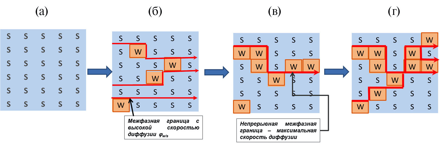 Рис. 4. Схема формирования непрерывного кластера в зерне люминофора: а) зерно (условно квадратное) состоит только из кристаллитов сфалерита (s); б) в зерне появляются кристаллиты со структурой вюрцита (w), поэтому, за счет появления границы раздела вюрцит/сфалерит, скорость диффузии постепенно возрастает; в) порог перколяции – формирование непрерывного трека для диффузии вдоль границы раздела вюрцит/сфалерит, скорость диффузии резко возрастает; г) разрастание перколяционного кластера. Стрелки показывают возможные треки диффузии ионов активатора и соактиватора вдоль границы раздела вюрцит/сфалерит.
