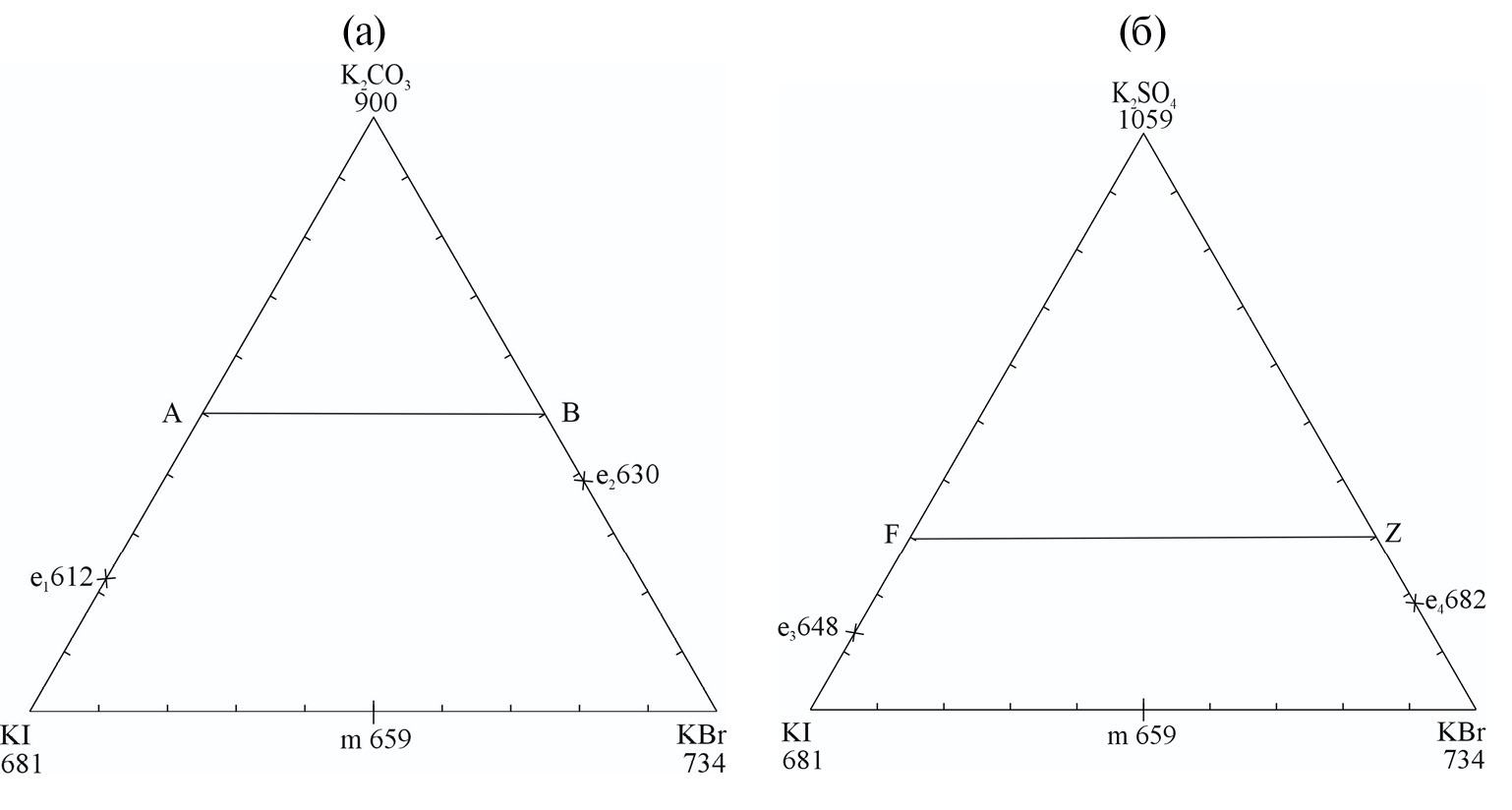 Рис. 6. Фазовый комплекс трехкомпонентных систем KI-KBr-K2CO3 (а) и KI-KBr-K2SO4 (б).