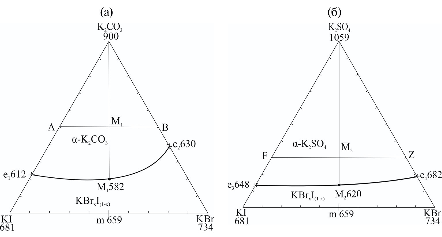 Рис. 5. Нонвариантные разрезы для трехкомпонентных систем KI-KBr-K2CO3 (а) и KI-KBr-K2SO4 (б).