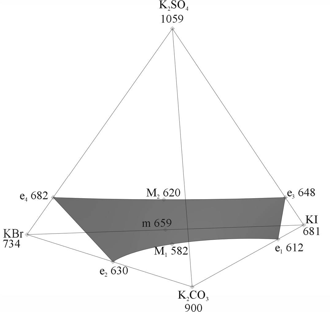 KI-KBr-K2CO3-K2SO4 объем кристаллизации представлен фазами KBrxI(1-x), K2(CO3)x(SO4)(1-x). Экспериментально подтверждено, что точки экстремума в системе не существует.