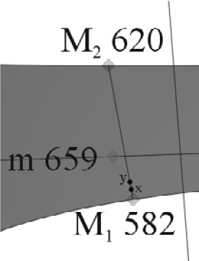 Рис. 9. Точки х и у на линии, соединяющей M1 и M2 в четырехкомпонентной системе KI-KBr-K2CO3-K2SO4.