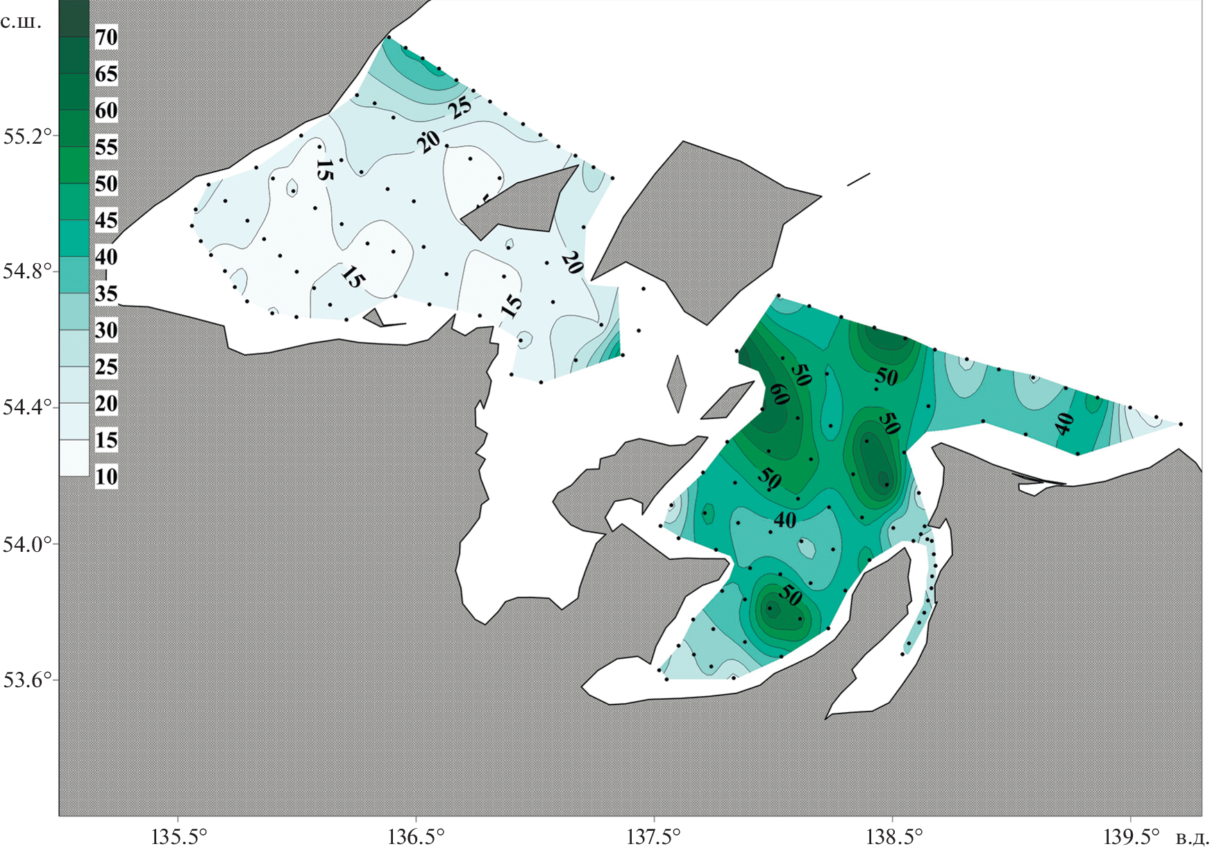 1. Аржанова Н.В., Зубаревич В.Л. Сезонные изменения содержания биогенных элементов в Охотском море как основа для оценки продукции фитопланктона // Комплексные исследования экосистемы Охотского моря. М.: ВНИРО. 1997. С. 92–97.