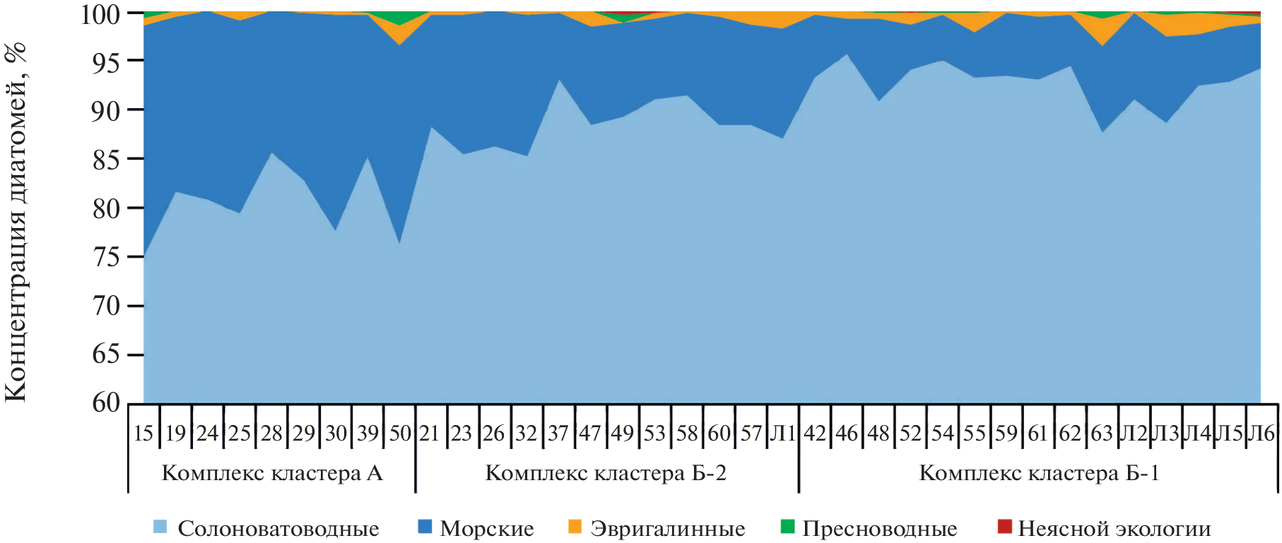 Представлены результаты изучения диатомовых водорослей в поверхностных осадках зал. Академии (Охотское море). Обнаружена богатая диатомовая флора (187 видов и внутривидовых таксонов), представленная преимущественно морскими и солоноватоводными видами. Преобладание бенто-планктонных и бентосных видов указывает на значительную роль микрофитобентоса в зал. Академии. Выделенные с помощью кластерного анализа диатомовые комплексы однородны по таксономическому составу, но различаются экологической структурой, которая в основном определяется соленостью вод. Концентрация диатомей в осадках открытой части зал. Академии и кутовой части Ульбанского залива обусловлена высокой продуктивностью вод и литологическим составом осадков. Относительно низкое содержание диатомей в осадках связано с суровыми климатическими условиями региона, близкими к арктическим.