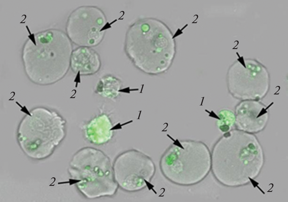 Клетки гемолимфы анадары Броутона Anadara broughtonii исследовали с помощью световой микроскопии, проточной цитометрии и градиентного центрифугирования. Все три метода анализа позволили идентифицировать в гемолимфе двустворчатого моллюска A. broughtonii два основных типа клеток – крупные гранулярные эритроциты и небольшие агранулярные амебоциты. Эритроциты составили 95.6 ± 0.9% от общего количества клеток гемолимфы. Эритроциты представляли собой гемоглобин-содержащие клетки с большим числом гранул в цитоплазме, низким ядерно-цитоплазматическим отношением (ЯЦО) и более низкой интенсивностью клеточного дыхания по сравнению с амебоцитами. Амебоциты – клетки преимущественно неправильной формы с высоким ЯЦО, не содержащие или содержащие не более 10 гранулярных включений в цитоплазме. Все типы гемоцитов, обнаруженные в гемолимфе анадары, продемонстрировали одинаковую способность к спонтанной продукции активных форм кислорода. Впервые показано, что эритроциты анадары Броутона способны к фагоцитозу, однако они поглощали в среднем в 2 раза меньше частиц зимозана (5.3 ± 0.1 шт.), чем амебоциты (10.3 ± 0.7 шт.).