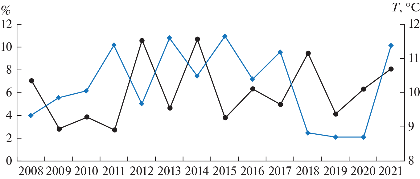 The seasonal and interannual variability in the frequency of occurrence of the North Pacific common minke whale (Minke whale) Balaenoptera acutorostrata scammoni Deméré, 1986 off the north-eastern coast of Sakhalin Island (the Sea of Okhotsk) in 2008–2021 was studied. It has been shown that the occurrence of whales of this species in the study area has significant seasonal and interannual variability. The average frequency of occurrence in even years of observations was 1.6 times higher than in odd years and amounted to 7.1 and 4.4%, respectively. It has been suggested that the frequency of occurrence of minke whale in the study area is determined by the intensity of coastal wind upwelling off the eastern coast of Sakhalin Island.