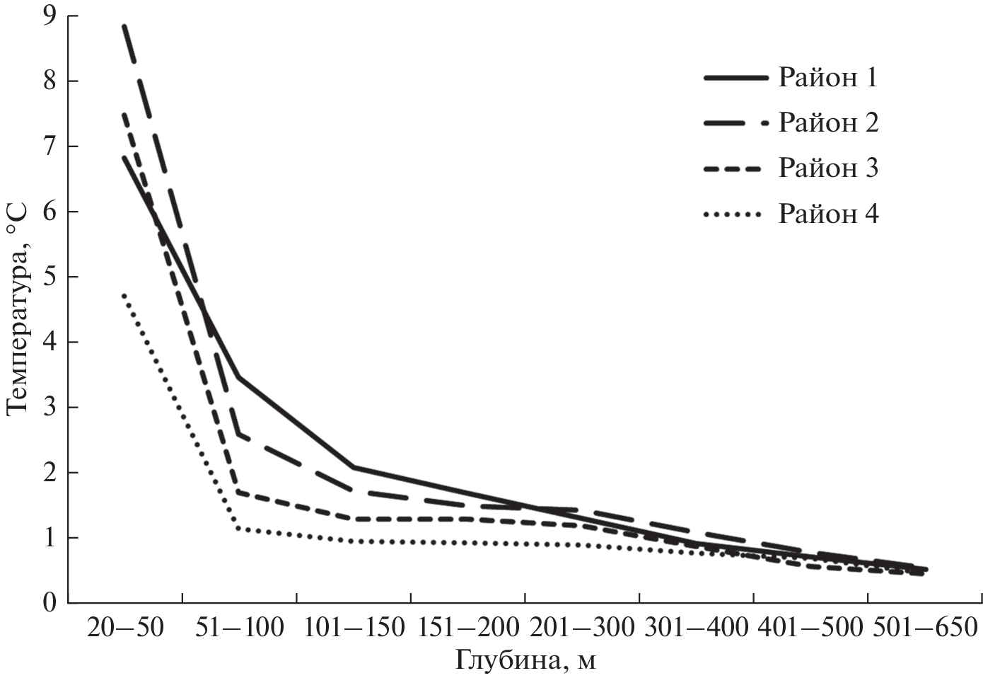 We identified Gymnocanthus detrisus as the absolute dominant species in the taxocene of sculpins (family Cottidae), caught below 20 m water depth in the aquatic area between Cape Povorotny and Cape Mapatsa. Myoxocephalus polyacanthocephalus, Gymnocanthus herzensteini, Enophrys diceraus and Triglops pingelii are dominant as well. Subdominant species are Triglops septicus, Icelus cataphractus, Hemilepidotus gilberti, Myoxocephalus brandtii, Myoxocephalus jaok, Taurocottus bergii and Gymnocanthus pistilliger. Other types of fishes identified in this area are insignificant in abundance. Sculpins aggregate at greater depth in the southern aquatic areas, from Cape Povorotny to Olga Bay, and from Olga Bay to Cape Belkin, than in the northern areas, between Cape Belkin and Cape Zolotoy, particularly between Cape Zolotoi and Cape Mapatsa. We attribute this phenomenon to the differences in water regimes. The highest densities of sculpins are generally typical for the southern area. Conversely the lowest densities are typical in the northern area. However, some species prefer northern areas. The minimum depths habitat for different species varying from less than 20 m to 82 m; the maximum depths range from 80 to 530 m. Due to the high species diversity, aggregations of sculpins are observed in a wide bathymetric range from 20 to 300 m, with peak values at depths of 150–200 m. Sculpins live in summer at water temperatures above 0.4°C. The shallow water species of sculpins tolerate much greater temperature ranges then deep water species. Hence, the stenotherm increases in deep water species.