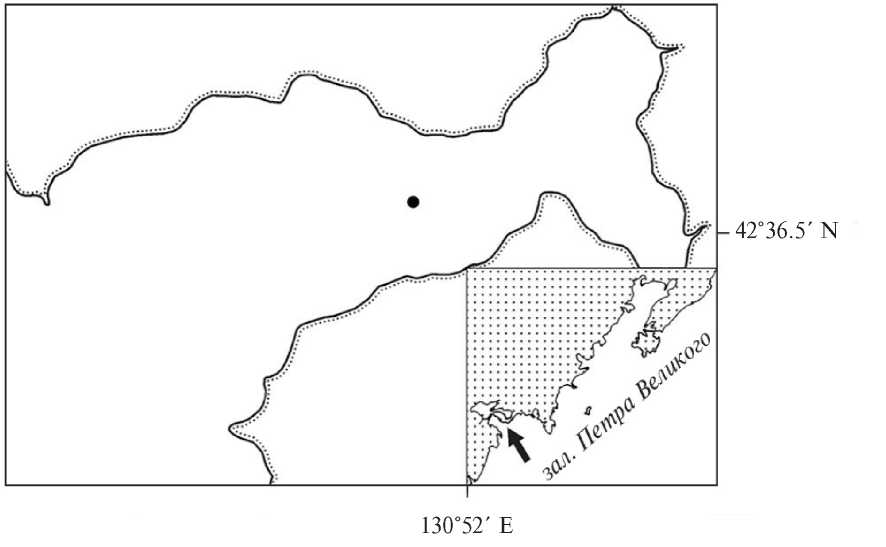 Особи мидий Mytilus trossulus и M. galloprovincialis, а также их гибридных форм были собраны 20 октября 2019 г. из обрастания канатов заброшенной коллекторной установки для выращивания гребешка в б. Миноносок зал. Петра Великого (42˚36′57″ С 130˚51′84″ В) (рис. 1).