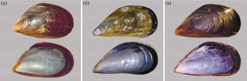 Рис. 2. Образцы раковин исследованных моллюсков: а – Mytilus trossulus (L = 32.9 мм), б – M. galloprovincialis (L = 35.9 мм), в – гибридные формы (L = 52.3 мм).