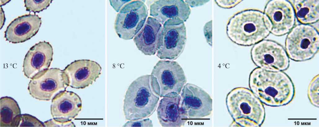 Рис. 1. Внешний вид эритроцитов при различной (13, 8, 4˚С) температуре содержания скорпены.