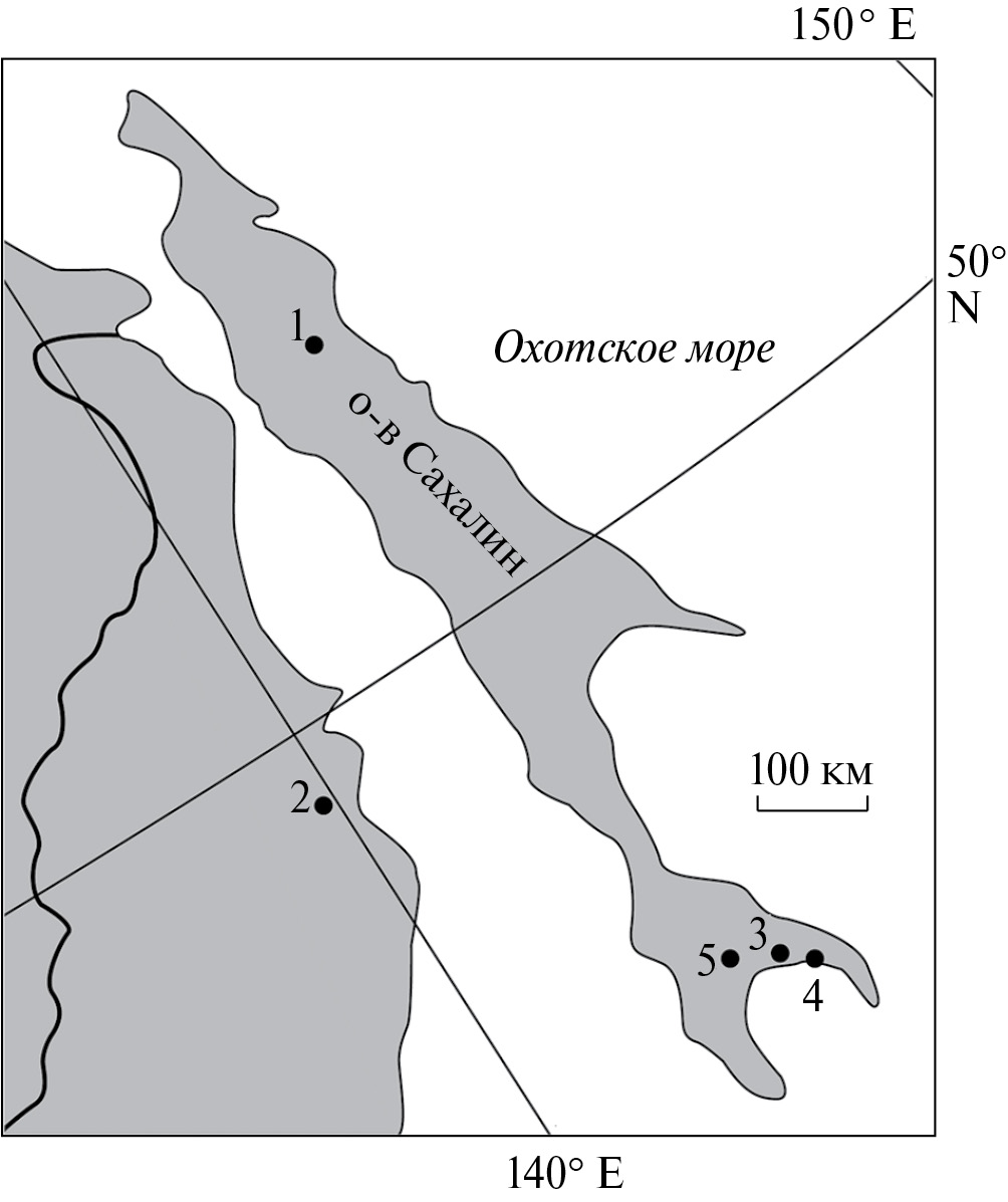 Рис. 1. Карта-схема района исследований и места сбора особей сахалинской красноперки Pseudaspius sachalinensis: 1 − р. Тымь, 2 – р. Тумнин, 3 − оз. Большой Чибисан, 4 − р. Проточная, 5 – р. Сусуя
