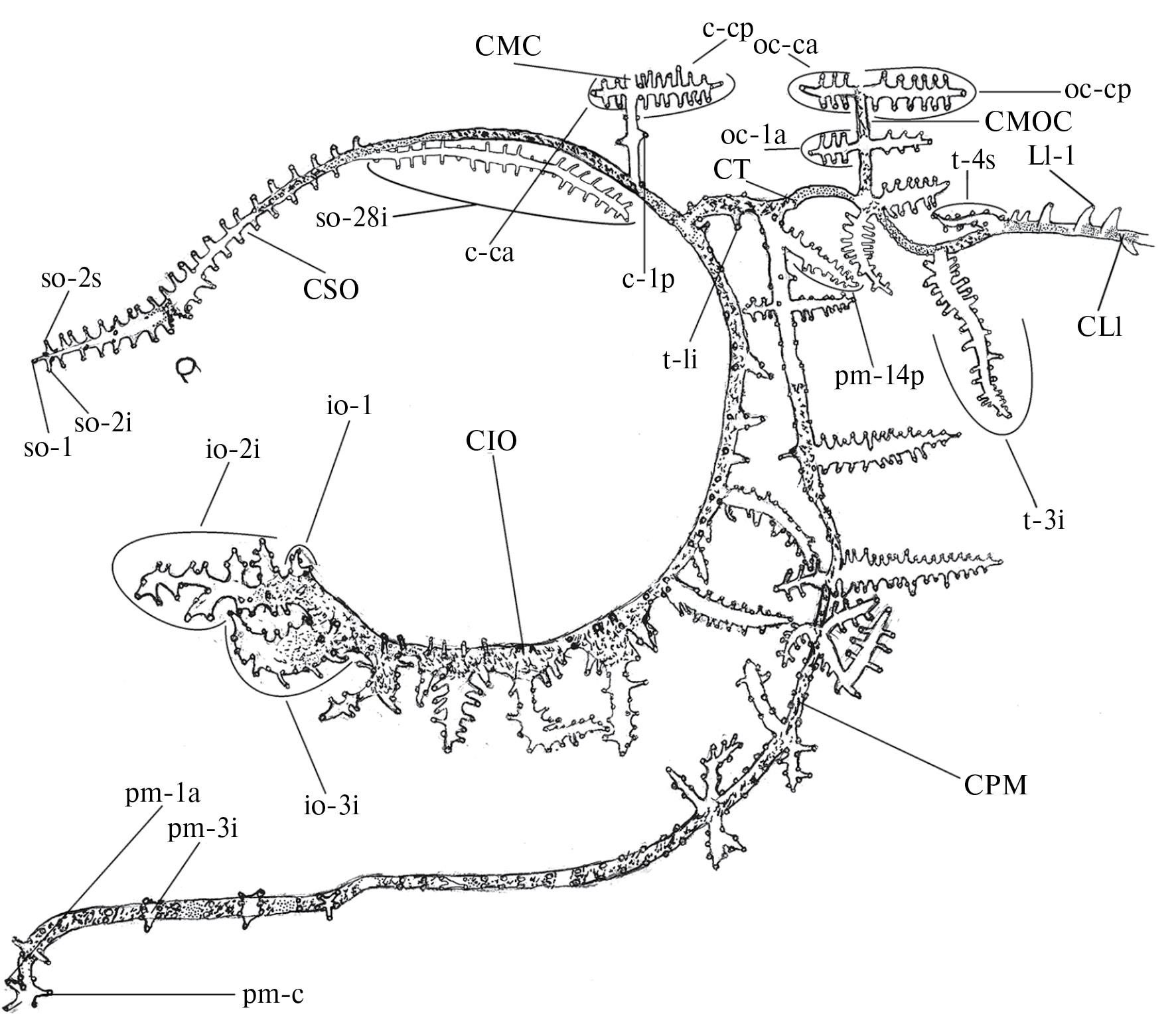 Рис. 1. Топография сейсмосенсорной системы Bovichtus variegatus (ЗИН № 36197 TL 121 мм), вид сбоку. Каналы: CSO – надглазничный, CIO – подглазничный, CT – височный, CPM – предкрышечно-нижнечелюстной и CLl – туловищный. Комиссуры: CMC – корональная и CMOC – затылочная. Канальцы: so-1–30 – надглазничные; io-1–18 – подглазничные; pm-c и pm-1–14 – предкрышечно-нижнечелюстные; t-1–7 – височные, с-1р и c-c – корональные, ос-1а и ос-с – затылочные, Ll-1 – 1-ый туловищный