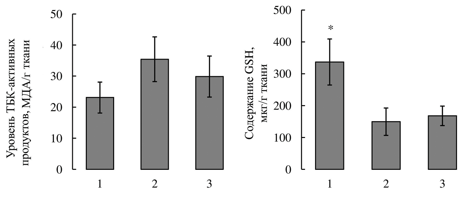 Рис. 2. Уровень ТБК-активных продуктов и глутатиона (GSH) в тканях гребешка Flexopecten glaber ponticus (1 – гепатопанкреас, 2 – жабры, 3 – мускул; *достоверные отличия от значений в других тканях (p ≤ 0.05–0.01))
