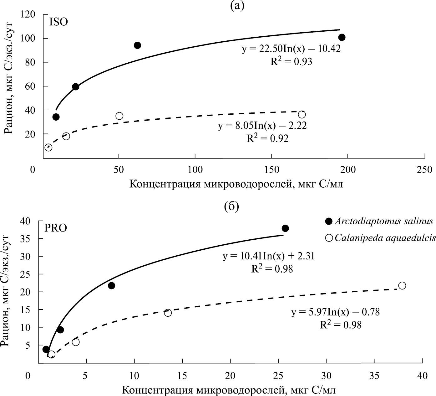 Динамика значений суточного рациона (G) копепод Arctodiaptomus salinus и Calanipeda aquaedulcis при питании микроводорослями Isochrysis galbana и Prorocentrum cordatum представлена на рис. 1 и в табл. 1 и 2. Рационы копепод возрастали логарифмически с увеличением содержания пищи в среде и почти выходили на плато при максимальной концентрации микроводорослей. При одинаковых исходных концентрациях микроводорослей значения суточного рациона были значимо выше у AS, чем у CA, что обусловлено большей массой первого вида (масса AS = 7.12 мкг С/экз., масса CA = 2.4 мкг С/экз.). Более высокие рационы копепод обоих видов как в количестве клеток, так и в углеродном эквиваленте получены при питании мелкоразмерными ISO по сравнению с PRO.