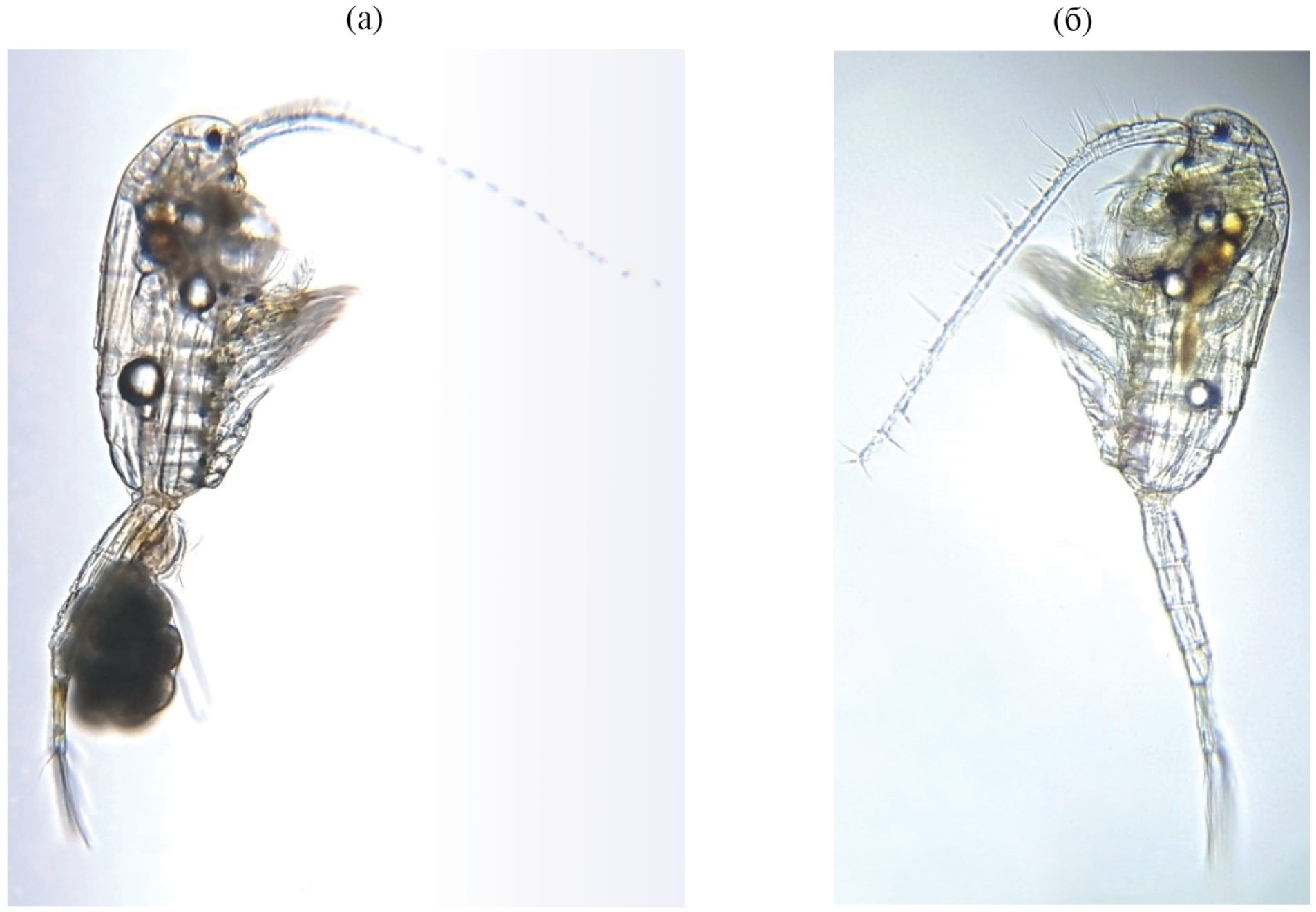 Рис. 2. Самка (а) и самец (б) Calanipeda aquaedulcis с жировыми каплями после избыточного кормления микроводорослями (Фото Л.С. Светличного)