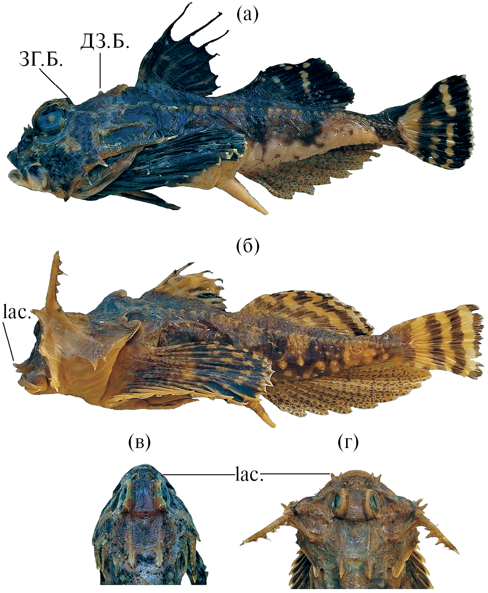Рис. 1. Двурогие бычки группы Enophrys diceraus: а, в – самец SL 182.4 мм, зал. Аякс, Японское море (а – вид сбоку, в – вид головы сверху); б, г – самец SL 180.0 мм, Тайская губа, Охотское море, (б – вид сбоку, г – вид головы сверху). Условные обозначения: ДЗ.Б. – дополнительный затылочный бугор, ЗГ.Б. – заглазничный бугор, lac. – lacrimale.