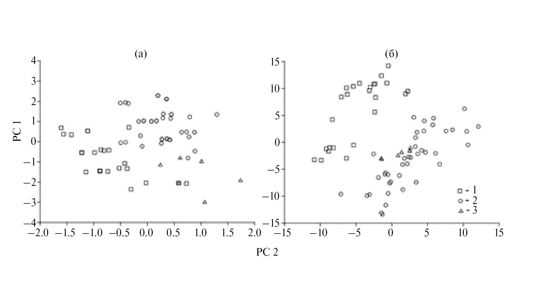 Сравнение выборок по пластическим и меристическим признакам проводили отдельно с помощью метода главных компонент (PCA).