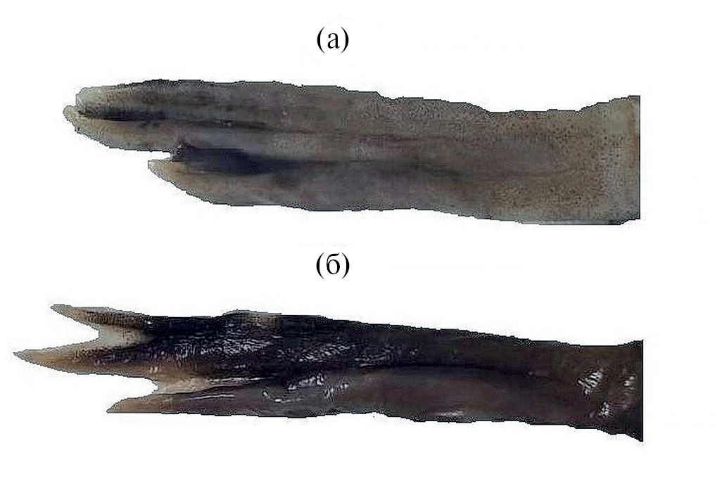 Рис. 3. Концы лучей брюшных плавников двурогих бычков группы Enophrys diceraus из Японского (а) и Охотского (б) морей.