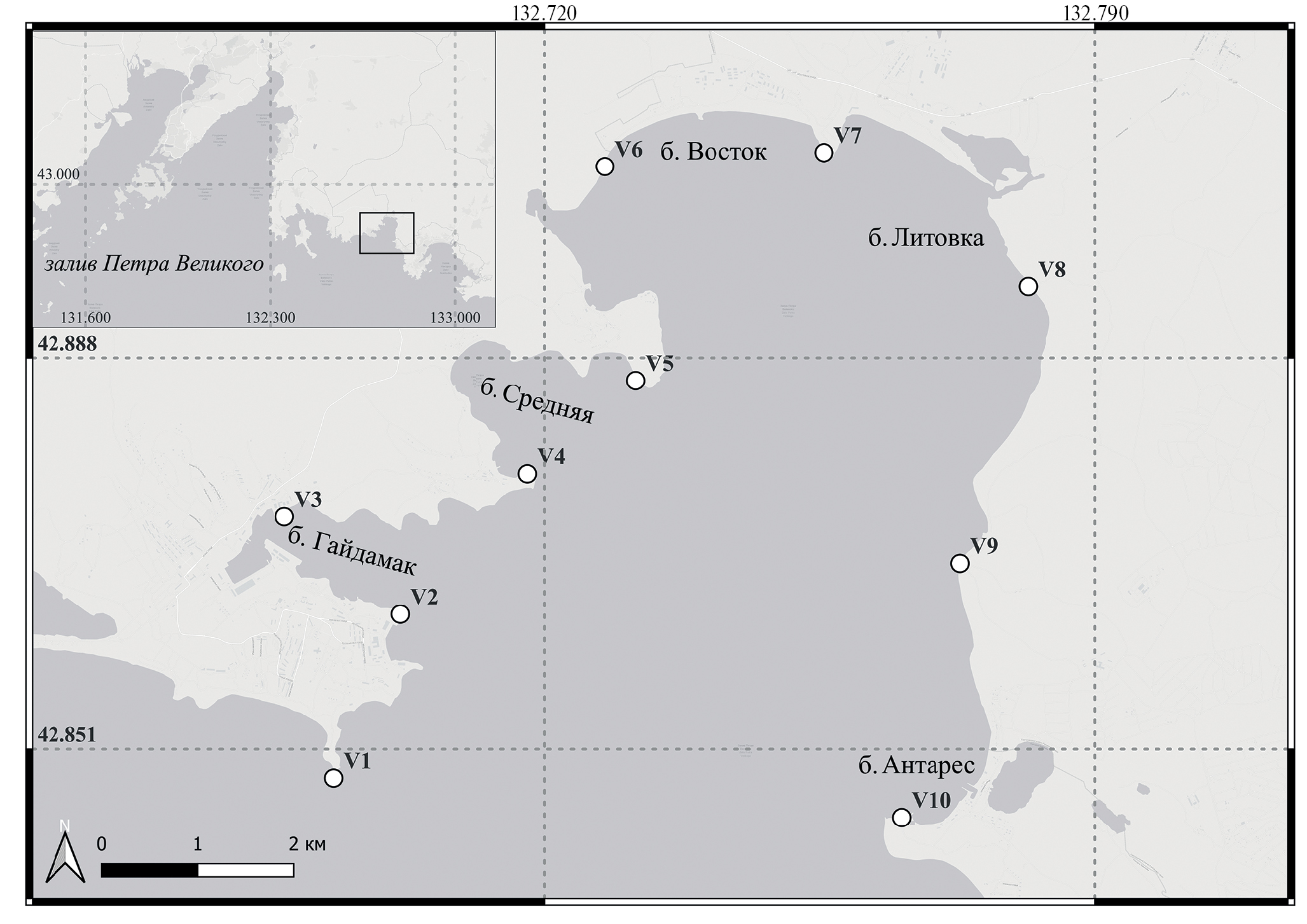 Залив Восток (зал. Петра Великого, Японское море) в течение долгого времени являлся эталонной акваторией при оценке уровней загрязнения Амурского и Уссурийского заливов, а также зал. Находка. В настоящее время зал. Восток приравнивают к акваториям, испытывающим среднюю антропогенную нагрузку, что связано с развитием сельскохозяйственной и рекреационной деятельности, а также с активным функционированием промышленных предприятий в западной части залива на побережье бухт Гайдамак (в поселках Южно-Морской и Ливадия) и Восток (пос. Волчанец). В зал. Восток на протяжении нескольких десятилетий ведутся мониторинговые исследования (Галышева, Христофорова, 2007; Барышева и др., 2019; Григорьева и др., 2020, Христофорова и др., 2020, 2023), в том числе и работы по биотестированию. Однако ранее основное внимание уделялось анализу качества воды (Маркина, 2008; Маркина, Айздайчер, 2011; Журавель и др., 2012; Журавель, Подгурская, 2014), и результаты оценки основывались на реакции одного тест-организма.