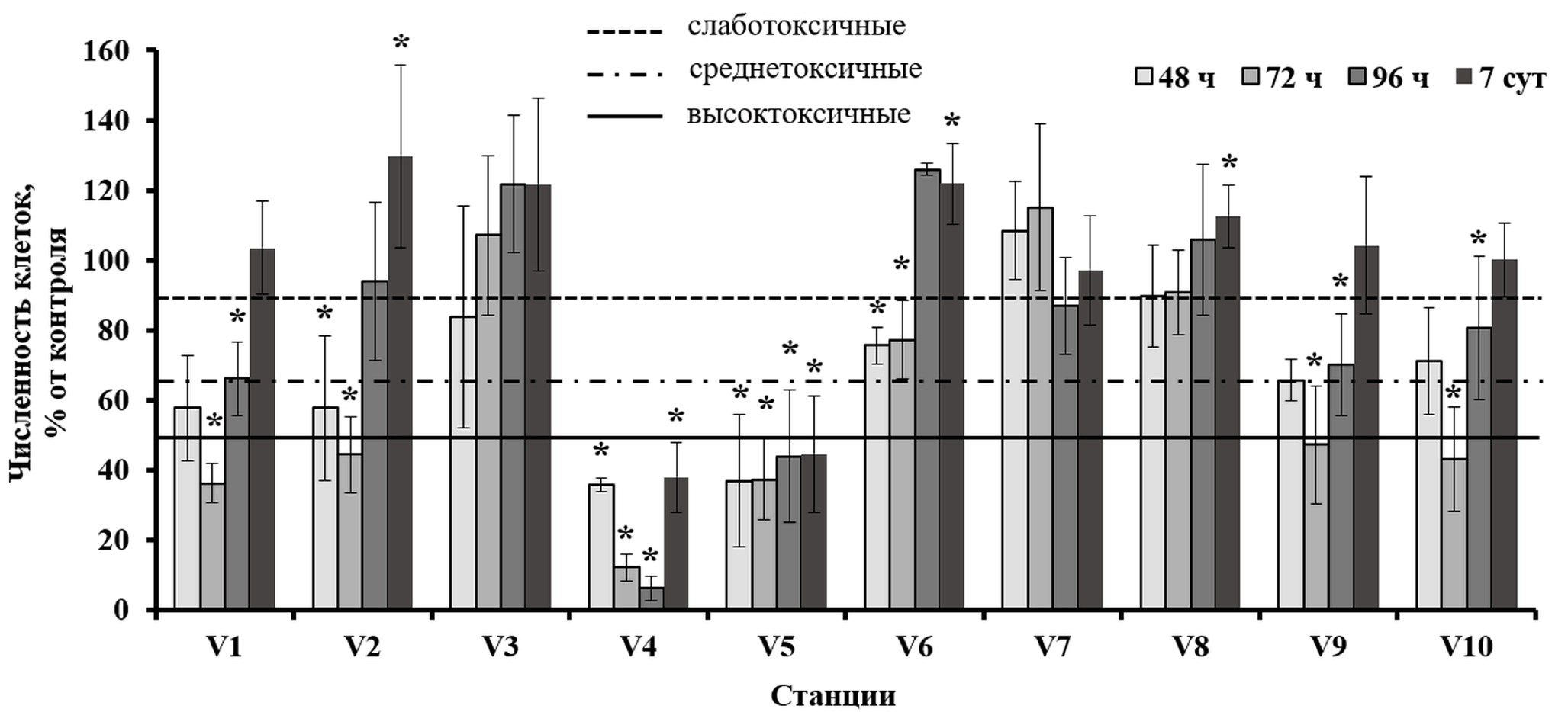 Через 96 ч в большей части тестируемых образцов наблюдался заметный прирост численности микроводорослей, до 122–126% от контроля в пробах со ст. 3 и 6. К 7 сут численность клеток в большинстве проб приблизилась к контрольному уровню, а на ст. 2, 3 и 6 превысила его более чем на 20%. Исключением из общей тенденции к росту численности клеток стали пробы со ст. 3 и 4, вытяжки из которых по-прежнему вызывали ярко выраженное ингибирование культуры микроводорослей.