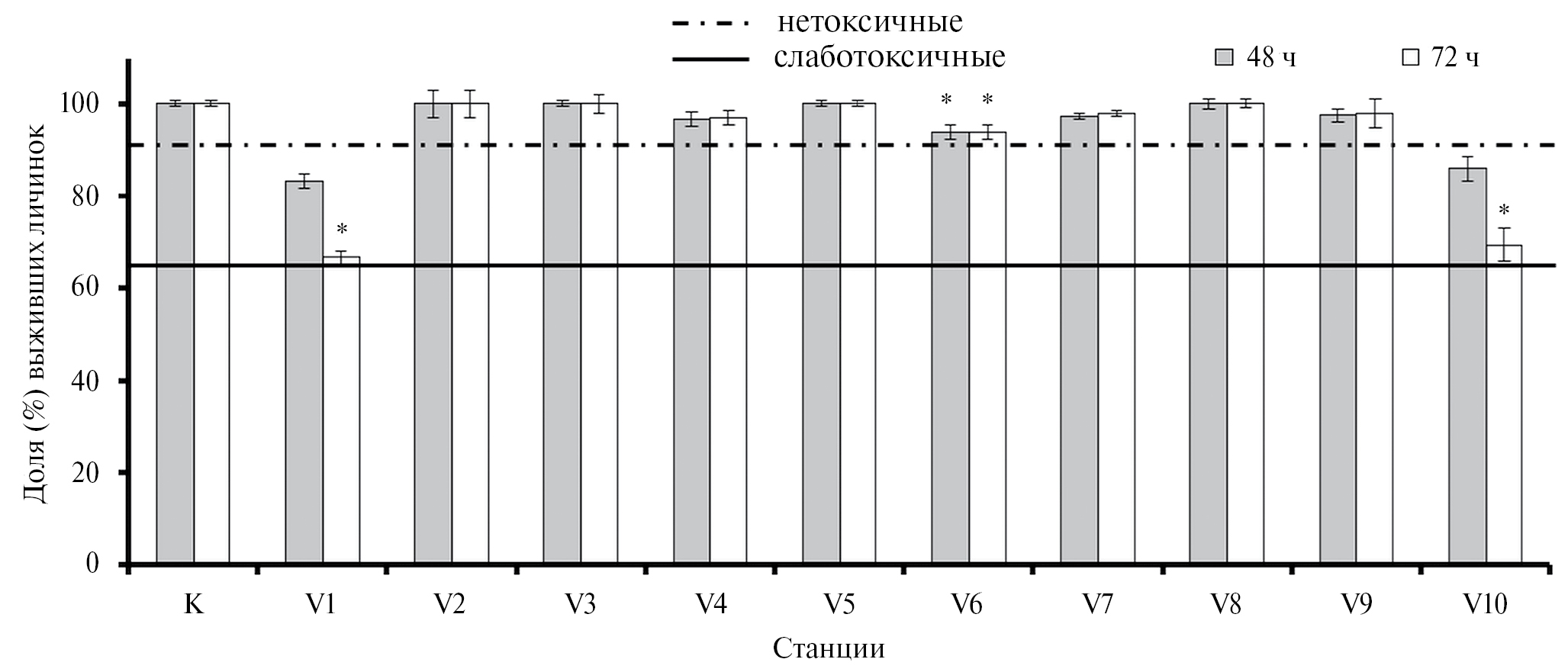 Достоверное снижение выживаемости науплиусов Artemia salina после 72 ч от начала эксперимента (рис. 3) отмечено в вытяжках из донных отложений, взятых у входных мысов (ст. 1, 10), а также из устья р. Волчанка (ст. 6). Пробы с большинства станций для артемий оказались нетоксичными. Меньшее количество выживших личинок, выявленное в образцах со ст. 1 (67%) и ст. 10 (69%) при 100%-й выживаемости в контроле, свидетельствует о слабой токсичности осадков.