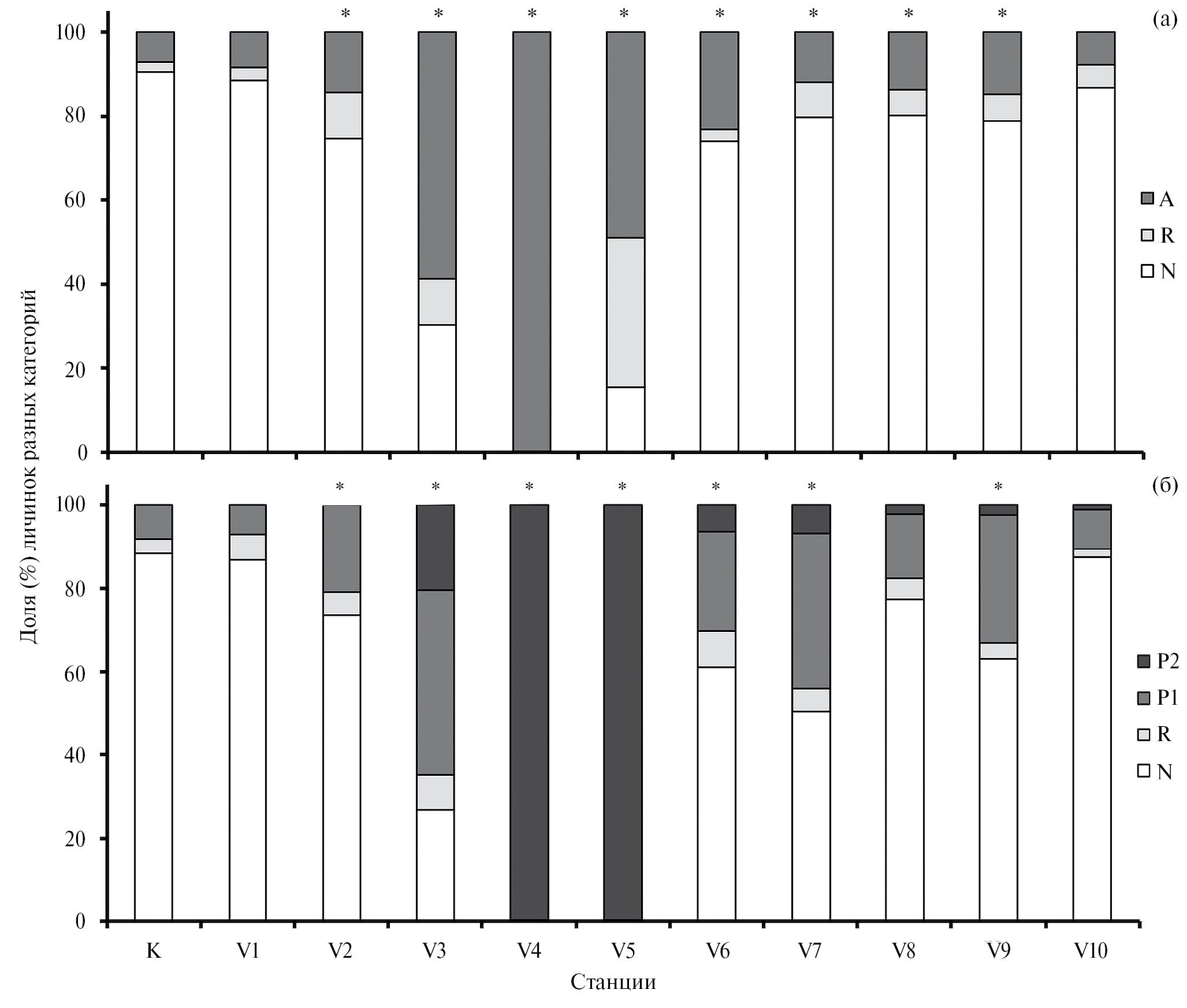 Рис. 4. Эмбриотоксическое воздействие вытяжек донных осадков на личинок плоского морского ежа Scaphechinus mirabilis: а – через 18 ч экспозиции; б – через 48 ч экспозиции. Условные обозначения: N – нормально развивающиеся личинки; A – гаструлы с аномалиями развития; R – личинки, отстающие в развитии; P1 – уродливые личинки с нарушениями формирования и дифференциации пищеварительной системы или личиночного скелета; P2 – личинки, развитие которых остановилось на стадиях бластулы или гаструлы. * Отличие от контроля достоверно при р ≤ 0.05.
