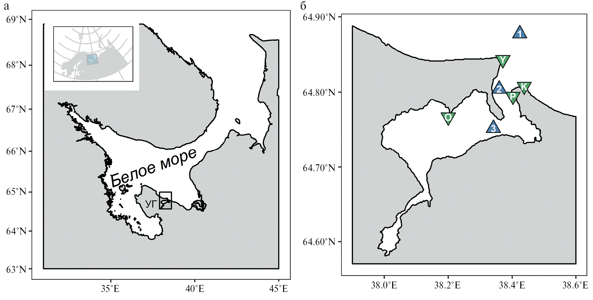Унская губа, глубоко вдающаяся в материк на Онежском полуострове (рис. 1а), мелководная с пологими берегами, глубина не превышает 7–10 м. Грунт представлен средне- и мелкозернистыми песками, в кутах бухт – заиленным песком, в районах мысов встречается галечный и, реже, валунный грунт. Губа характеризуется значительным опреснением даже в мористой своей части: в горле губы соленость колеблется от 17–20‰ весной до 24–26‰ зимой (Чугайнова, 2007).