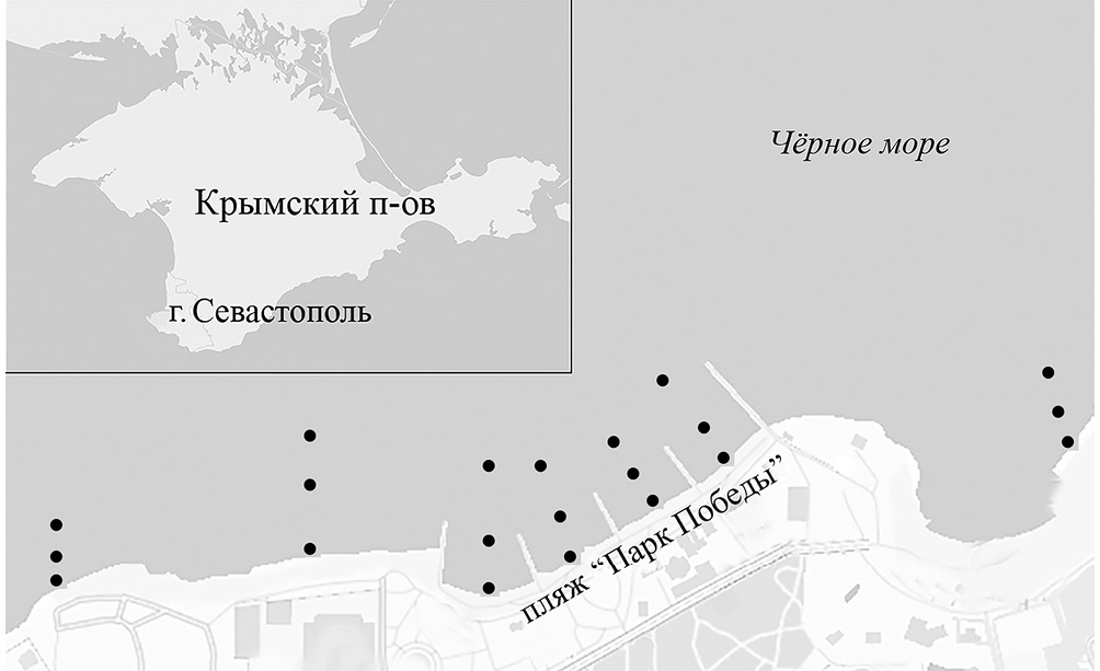 В работе использованы материалы гидроботанических съемок, проводившихся в июле 1985, 2004 и 2015 гг. в прибрежной морской акватории г. Севастополь (район парка Победы) (рис. 1). Здесь на участке протяженностью около 1 км расположен городской пляж с гидротехническими сооружениями, предохраняющими берег от размыва.
