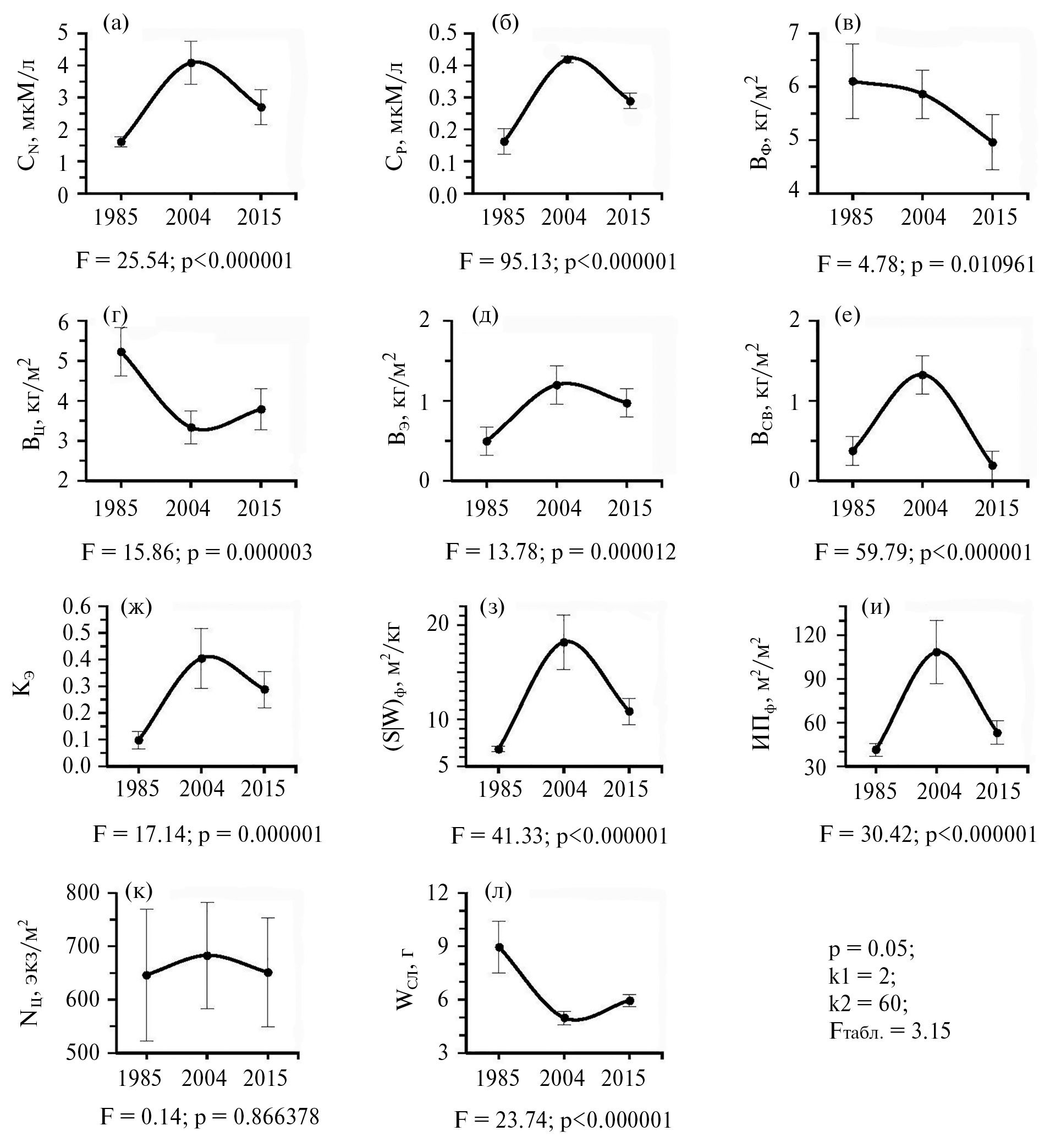 Рис. 2. Межгодовые изменения анализируемых признаков макрофитобентоса и характеристик среды из прибрежной акватории парка Победы г. Севастополь: а – концентрация минерального азота в воде (СN), б – концентрация минерального фосфора в воде (СP), в – биомасса фитоценоза (BФ), г – биомасса цистозиры (BЦ), д – биомасса эпифитов (BЭ), е – биомасса сопутствующих видов (BСВ), ж – коэффициент эпифитирования цистозиры (КЭ), з – удельная поверхность фитоценоза (S/W)Ф, и – индекс поверхности фитоценоза (ИПФ), к – плотность популяции цистозиры (NЦ), л – средняя индивидуальная масса слоевища цистозиры (WСЛ). Вертикальная ось – значения анализируемых признаков, горизонтальная – годы проведения исследований. Приведены средние значения признаков ± доверительный интервал = 0.95; F – критерий Фишера, p – уровень значимости, k1 и k2 – число степеней свободы соответственно межгрупповой и внутригрупповой дисперсий.