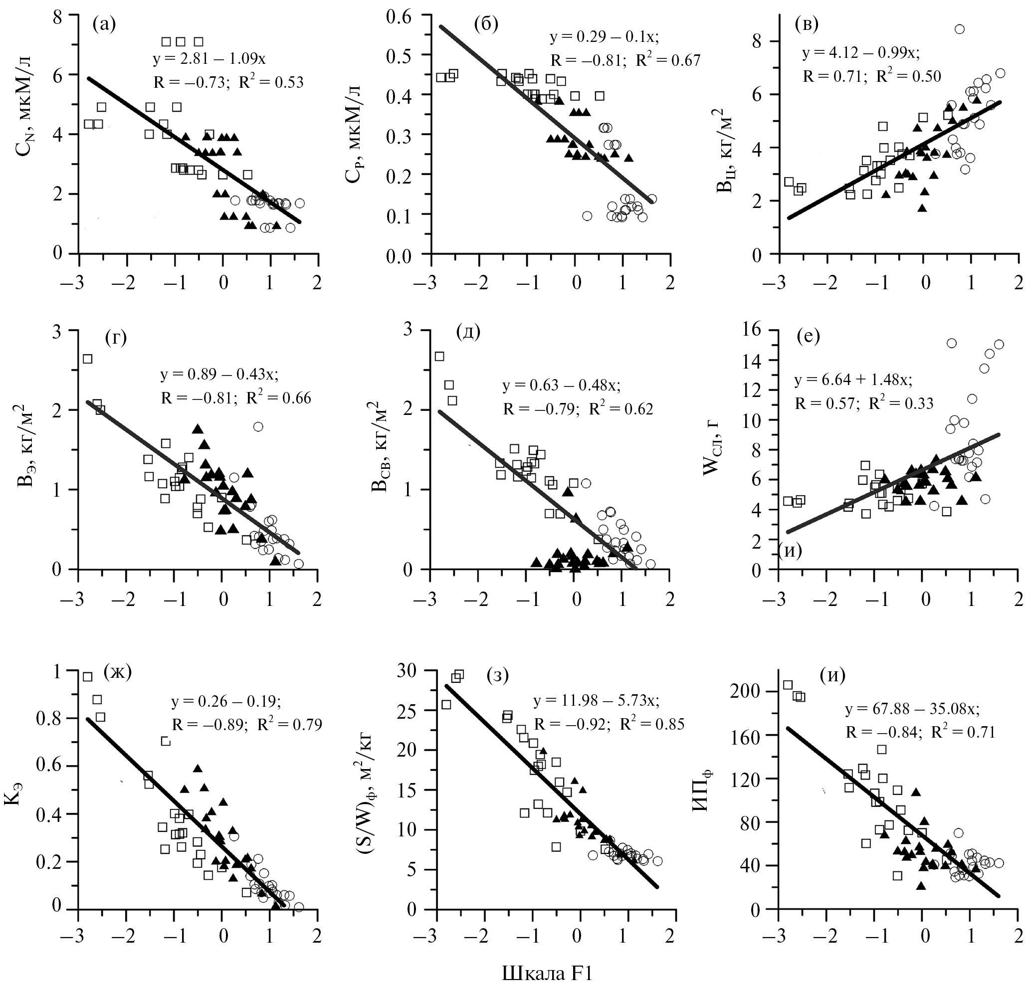 Увеличению F1 соответствует снижение биогенной нагрузки (рис. 4а, 4б), т. е. повышение трофности направлено в противоположную сторону, справа налево. Как отмечалось выше, увеличение биогенной нагрузки ведет к линейному увеличению большинства переменных, но отрицательно воздействует на параметры цистозиры. Коэффициенты детерминации уравнений, описывающие зависимость параметров от F1, имеют высокие значения R2 = 0.5–0.9, за исключением R2 = 0.33 для WСЛ (рис. 4).