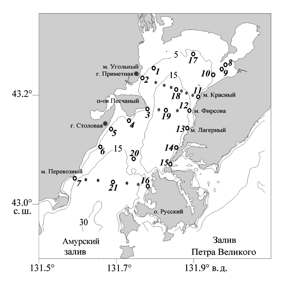 Гидролого-гидрохимическое обследование состояния вод Амурского залива проводили 2–3 июля 2022 г. Наблюдения включали профилирование водной толщи автономным CTD зондом на 35-ти гидрологических станциях, на 21-й из них отбирали пробы воды из поверхностного слоя на микробную индикацию. Места отбора проб воды (номера станций указаны на рис. 1), которые определяли с учетом предполагаемых источников загрязнения, в основном располагались на мелководье вдоль западного (ст. 1–7) и восточного (ст. 8–16) побережий. Фоновые станции (ст. 17–21) выбраны на осевой линии залива, где глубина достигала 25 м. Предназначенные для уточнения распределения контролируемых параметров дополнительные станции, на которых выполняли только CTD профилирование, располагались на трех поперечных разрезах: г. Приметная – мыс Красный (ст. 2, 18 и 11), п-ов Песчаный – мыс Фирсова (ст. 3, 19 и 12) и мыс Перевозный – мыс Михайловского на о-ве Русский (ст. 7, 21 и 16) (рис. 1).