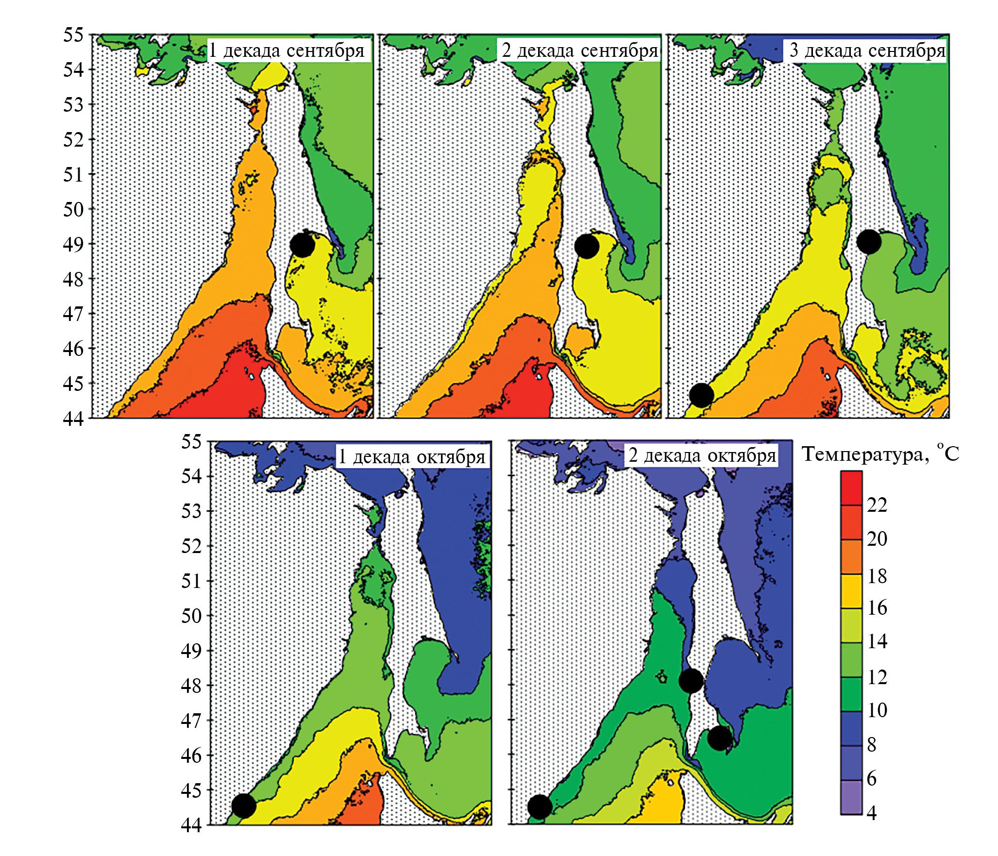 Значения температуры поверхности воды в сентябре и октябре 1997–2022 гг. у побережья о-ва Сахалин (зал. Анива) и берегов северного Приморья, взятые из осредненных подекадно спутниковых данных (рис. 6), не характеризуют в полной мере гидрологические условия в прибрежье, однако показывают, что температура воды в этот период около 10°С, что близко к оптимальной для начала нерестовых подходов и нереста волосозуба. В зал. Терпения подходящие условия в прибрежье наступают примерно на полмесяца раньше, в начале–середине сентября. (Ширманкина 1995, 1996а, 1996б; Колпаков, 1999, 2004; Загуменская, 2019).