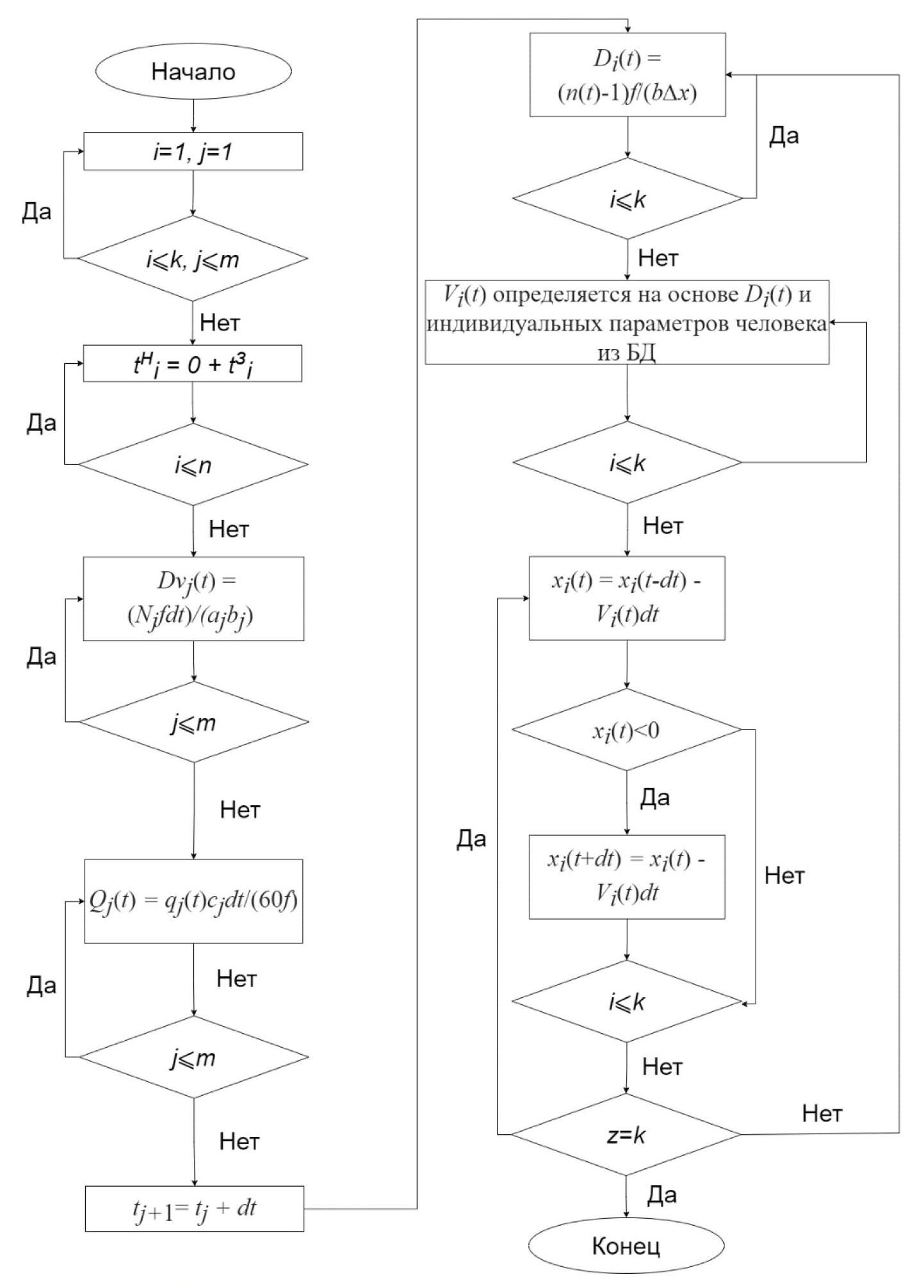 В рамках разработки программного приложения по моделированию эвакуации реализуется индивидуально-поточная модель, так как она наиболее точно описывает процесс движения каждого отдельного сотрудника в потоке и, следовательно, полученные при ее использовании результаты будут значительно лучше коррелировать с реальным временем эвакуации. Блок-схема алгоритма представлена на рис. 1, где даны следующие обозначения: i – id-сотрудника; j – id-участка, на котором он находится; m – число участков; k – количество сотрудников; tнi – реальное время начала эвакуации; tзi – время задержки, dt – приращение по времени (принимается равным 0,25 с); z – количество эвакуировавшихся (пересекших последний участок маршрута).