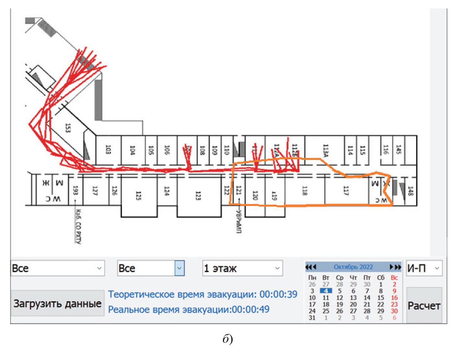 При работе с программой необходимо выбрать: конкретный этаж, на котором происходит эвакуация; сотрудников (можно выбрать как всех, так и только конкретных для удобства отображения); дату проведения эвакуации и конкретное помещение. Далее выбирается модель, по которой проводится моделирование эвакуации, так как ранее, помимо индивидуально-поточной, реализована упрощенная аналитическая модель. После нажатия на кнопку «Расчет» необходимо подождать до нескольких минут, в зависимости от условий моделирования. Далее на подложке схемы отобразятся все индивидуальные маршруты работников и теоретическое и реальное время эвакуации.