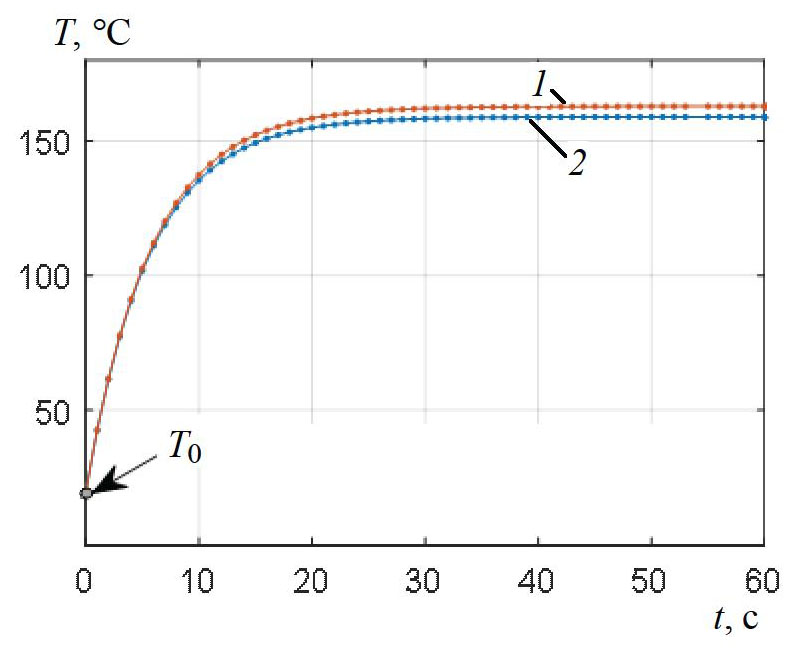 Существующие расчеты геометрии и режима работы нагревательных элементов, как правило, осуществляются без учета влияния температуры проводника на его сопротивление с использованием значения номинального сопротивления при некоторой «рабочей» температуре [6]. В ряде случаев осуществляется оценка работы проектируемой системы в различных температурных режимах с использованием табличных значений сопротивлений или расчетов сопротивлений по зависимостям, связывающим их с температурой [7, 8]. Действительно, при обогреве больших объемов воздух, использовании конвективного отвода тепла от проводника или в случае незначительных отклонений температуры включения от рабочей влиянием температуры можно пренебречь. Однако в случае нагрева сравнительно небольших объемов (когда может осуществляться локальный резкий нагрев проводника), низкой интенсивности конвекции около проводника, существенной зависимости сопротивления проводника от температуры и т.д. влияние температуры проводника на его сопротивление будет существенным и приведет к росту погрешности расчетов. В этом случае при расчетах и проектировании нагревательных элементов, а также при оценке их динамических характеристик необходимо использовать модель нагрева, учитывающую зависимость сопротивления проводника от температуры.