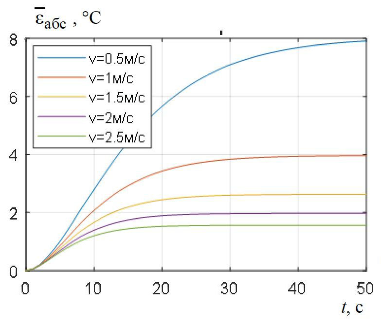 Рис. 5. Влияние скорости воздуха на изменение абсолютной погрешности расчета температуры спирали при ее нагреве