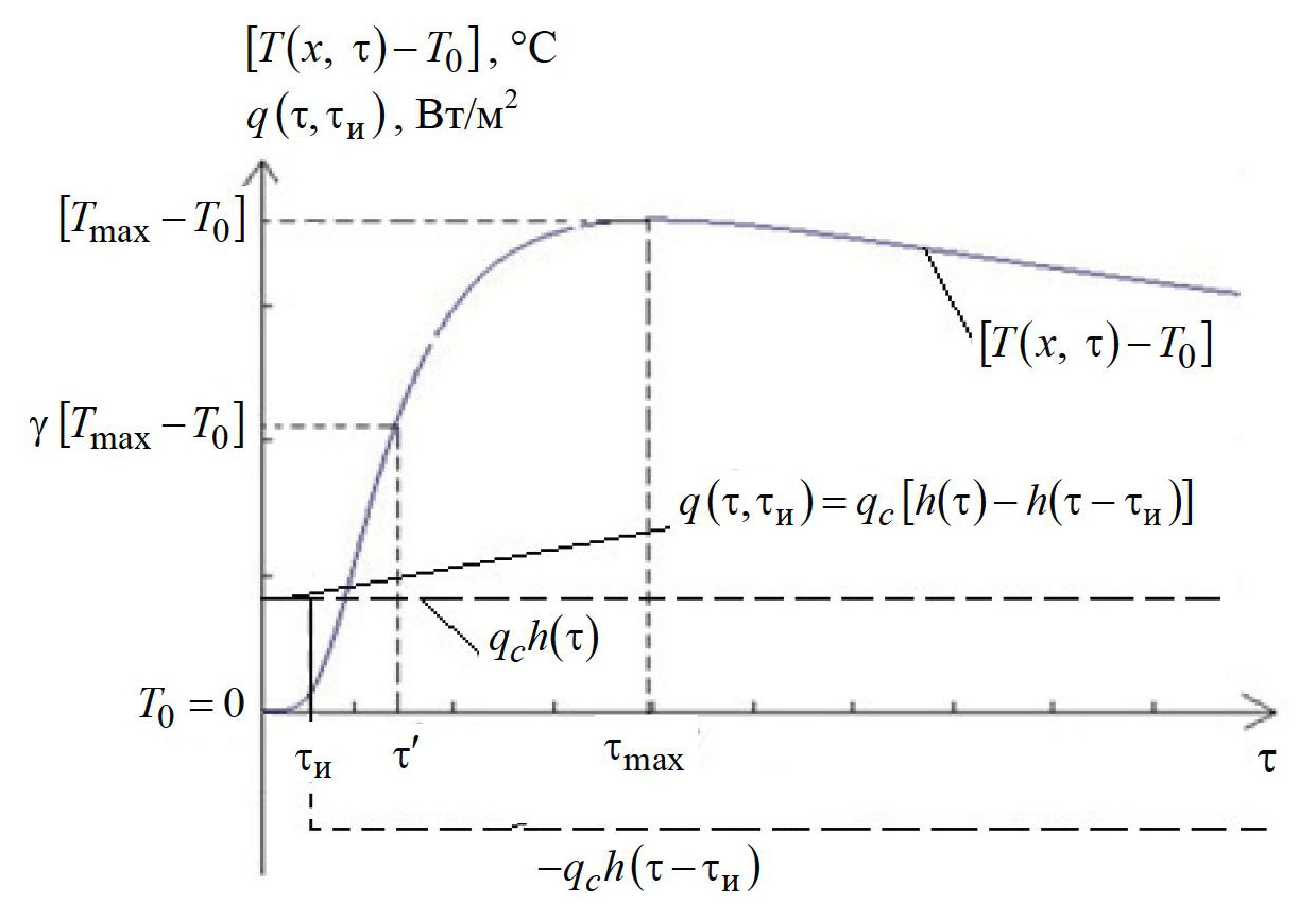 Рис. 1. Изменение во времени τ физических величин: теплового импульса q(τ, τи ) = qc [h(τ) – h(τ – τи )] , представляющего собой алгебраическую сумму ступенчатых функций qch(τ) и – qсh(τ – τи ); разности температур [T (x, τ) – T0] на расстоянии x от плоского импульсного источника теплоты