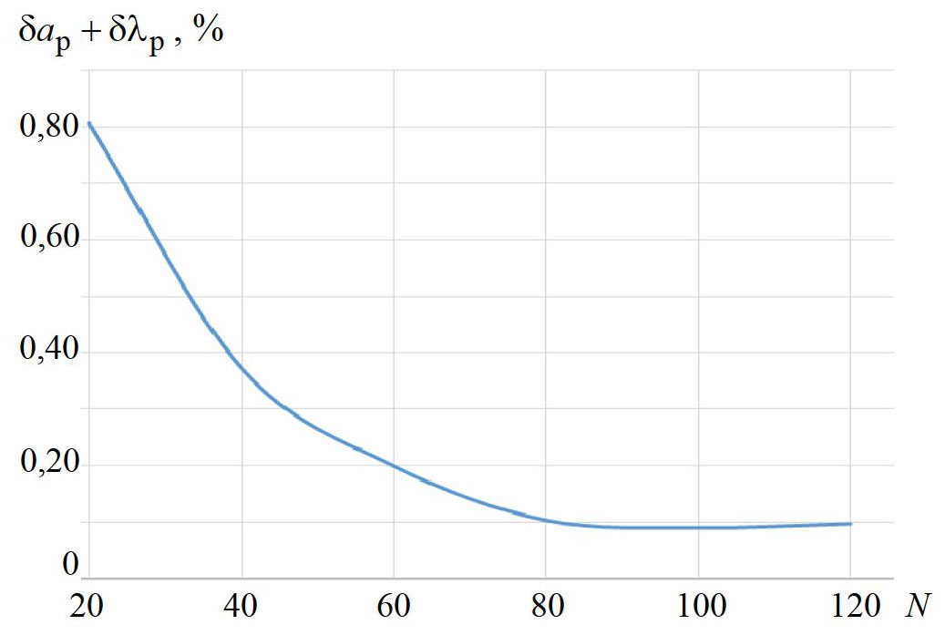 На рисунке 2 приведена зависимость суммарной погрешности δλp + δap от числа N экспериментальных точек. Очевидно, что при увеличении числа используемых экспериментальных точек сумма двух погрешностей δλp + δap уменьшается, причем, если при N = 20 суммарная относительная погрешность алгоритма обработки данных δλp + δap ≈ 0,8%, то при N = 50 и более погрешность алгоритма обработки не превышает величины 0,25%.
