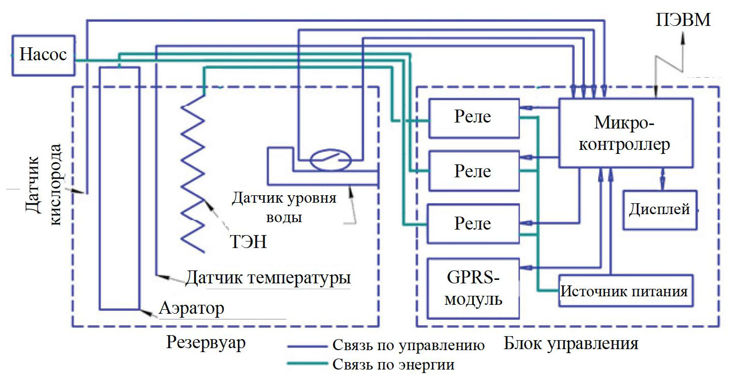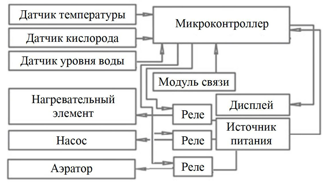 Данные с датчиков (температуры, кислорода и уровня воды) передаются на микроконтроллер, затем на дисплей АРМ в целях отслеживания текущего состояния оператором. Микроконтроллер подает сигнал о работе насоса, аэратора и нагревательного элемента в зависимости от полученных данных. При отсутствии сигнала с какого-либо датчика включается аварийный режим системы управления.