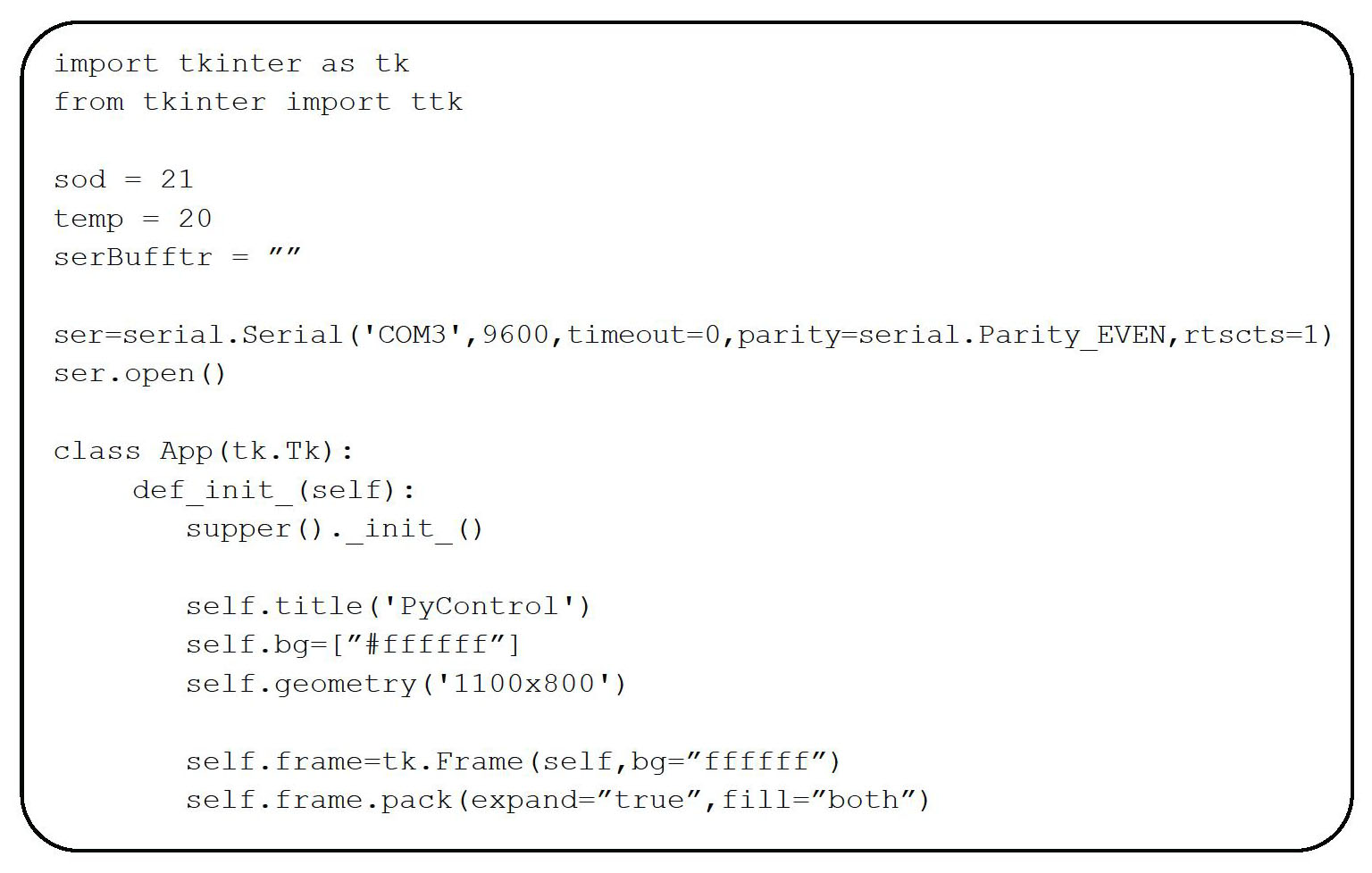 На автоматизированном рабочем месте оператора будет отображаться весь протекающий процесс в УЗВ, а также данные, полученные с датчиков. Программа АРМ использует библиотеки pySerial для работы с последовательным портом и Tkinter для создания интерфейса (рис. 4).