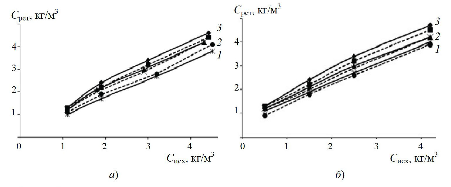 а, б – сисх = 0,5 кг/м3 (1) и 2,0 кг/м3 (2); в, г – сисх = 0,3 кг/м3 (1) и 1,5 кг/м3 (2)