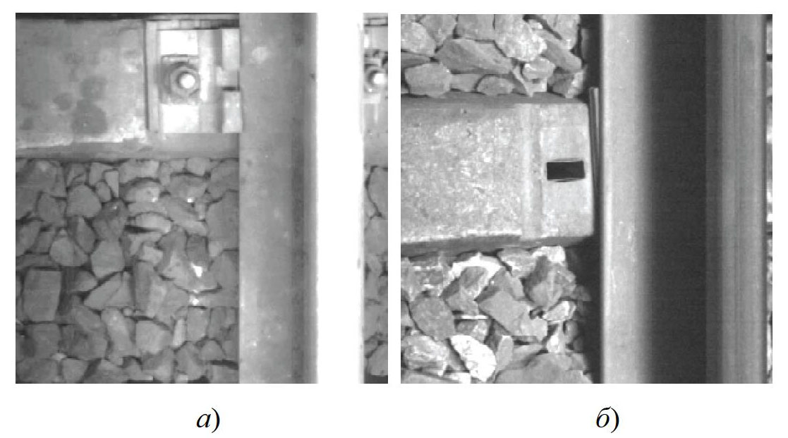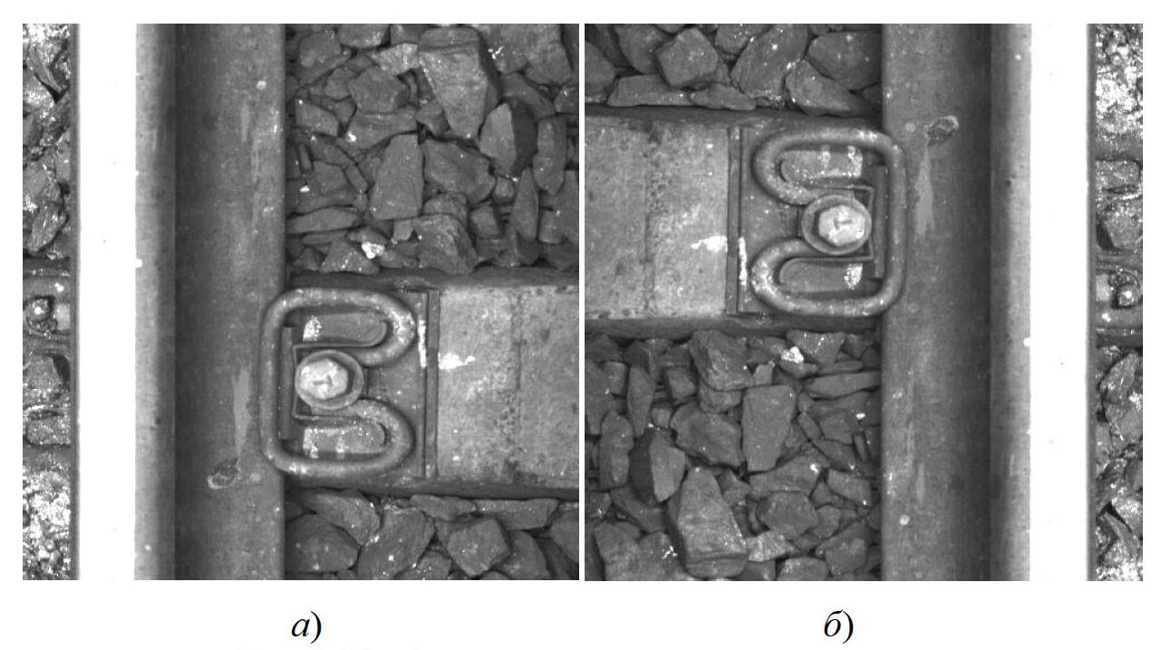 Рис. 1. Дефекты рельсовых скреплений: а – скрепление КБ с отсутствующей клеммой; б – изображение полностью отсутствующего скрепления