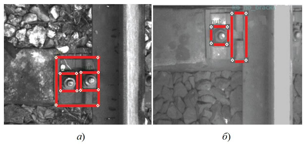 Рис. 2. Пример разметки скрепления КБ: а – исправное скрепление; б – скрепление с отсутствующей клеммой