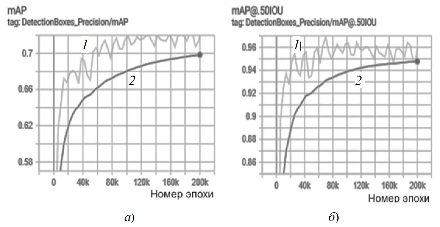 Графики, полученные для средней точности mAP в зависимости от эпохи обучения, приведены на рис. 5. Для классического mAP на момент завершения обучения получено значение 0,72, а для метрики mAP при IoU = 0,5 – точность 0,96, которая близка к идеальным результатам.