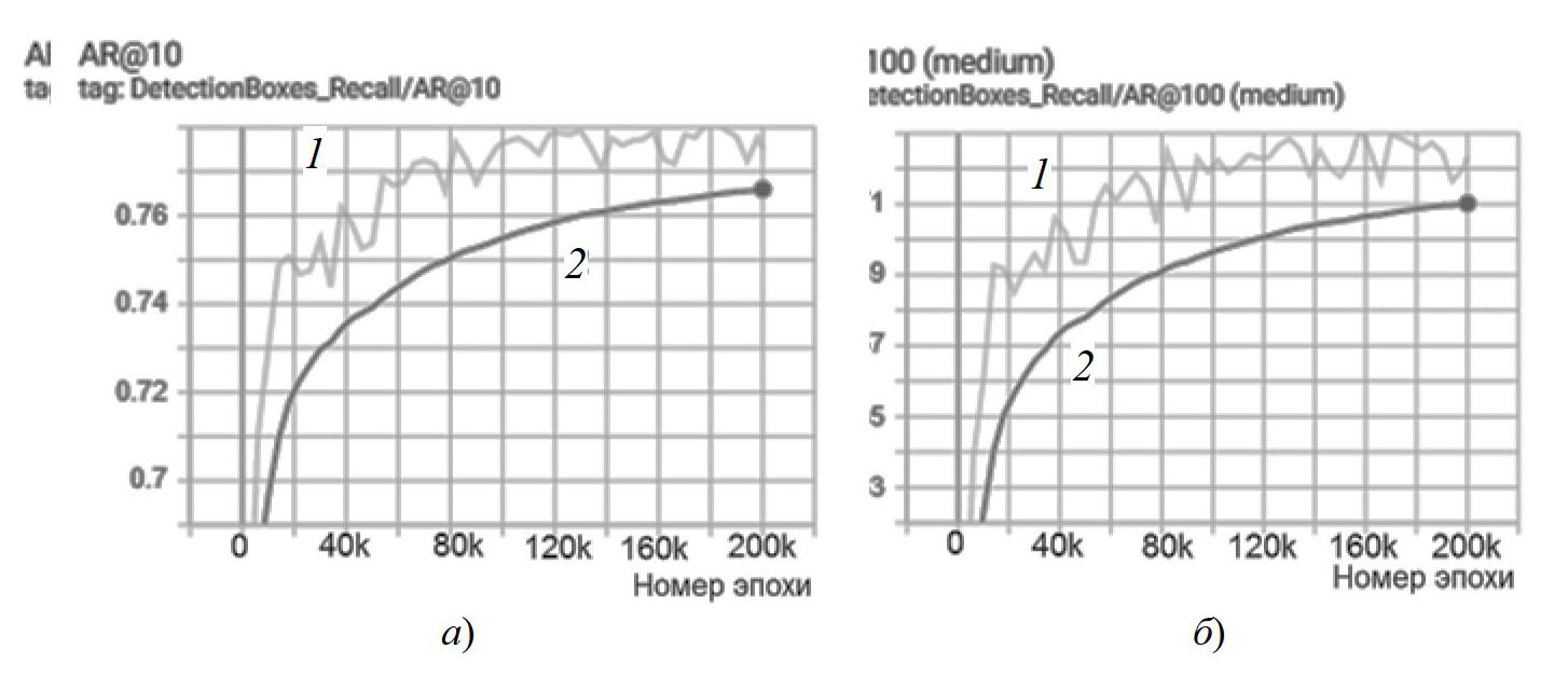 Рис. 6. Зависимости mAR от номера эпохи: а – AR@10; б – AR@100