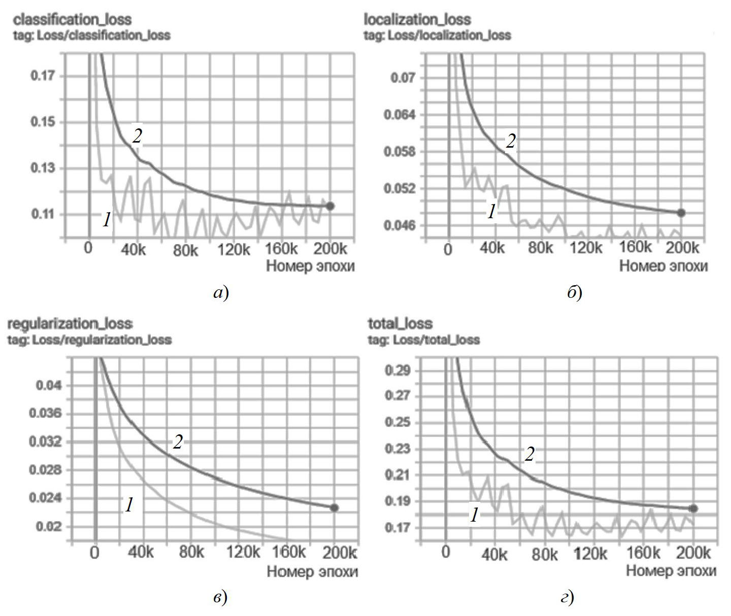 Рис. 7. Графики потерь: а – классификационные; б – локализационные; в – регуляризационные; г – общие потери