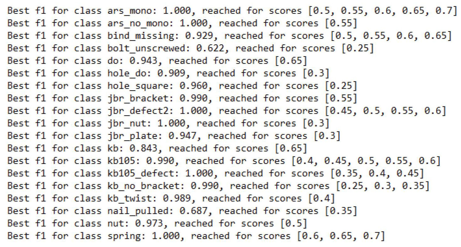Лучшим признается порог, для которого исследуемая метрика качества имеет максимальное значение. Если таких порогов несколько, то выбирается любой из них. Результаты оценки качества работы модели сохраняются в файл calc_thres.log. Фрагмент полученных записей для обученного в статье детектора приведен на рис. 8, где f1 соответствует метрике F1. Выбор порогов проводится по тестовой выборке изображений рельсовых скреплений.