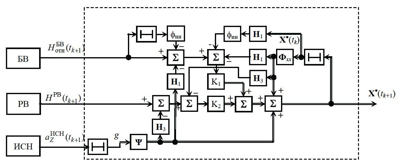 Уравнение (19) определяет структуру канала оптимальной обработки выходных сигналов БВ и ИНС. Структурная схема канала обработки информации в информационно-измерительной и управляющей системе – навигационно-посадочном комплексе по сигналам ИНС и БВ, разработанная на основе алгоритма (19) представлена на рис. 3.