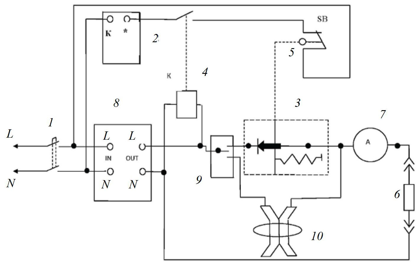 Эффект от внедрения устройства для проверки УЗДП достигается тем, что помимо источника электрической дуги, включенного последовательно в цепь, добавляется источник для параллельного дугового пробоя в виде образца кабеля с параллельными проводниками (см. рис. 5). В поврежденном образце кабеля при протекании тока формируется карбонизированный проводящий путь через изоляцию между двумя его проводниками. Ток короткого замыкания зависит от характера нагрузки и ее величины. Схема предлагаемого устройства представлена на рис. 6.